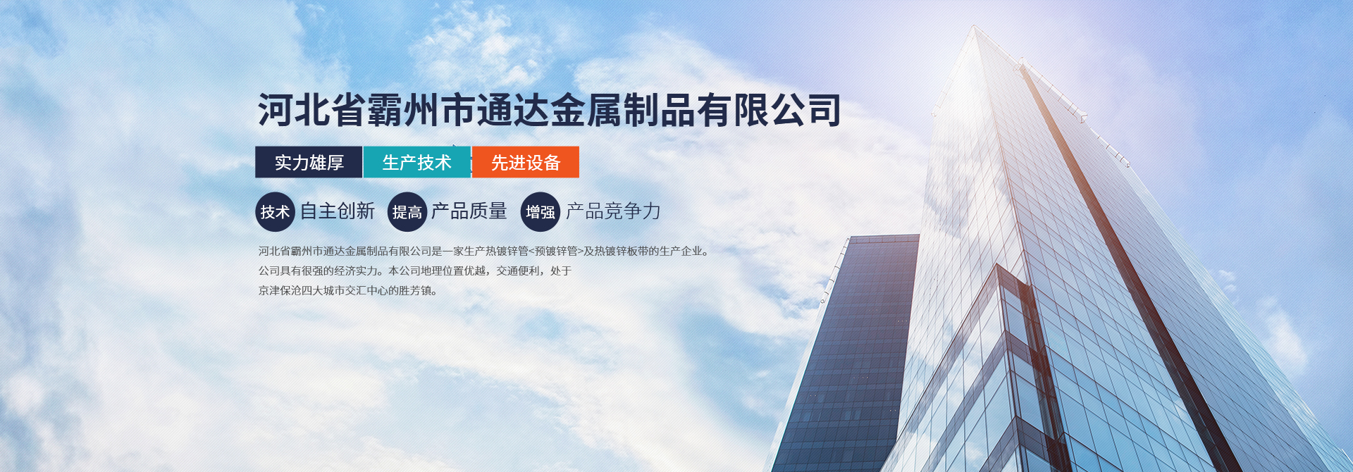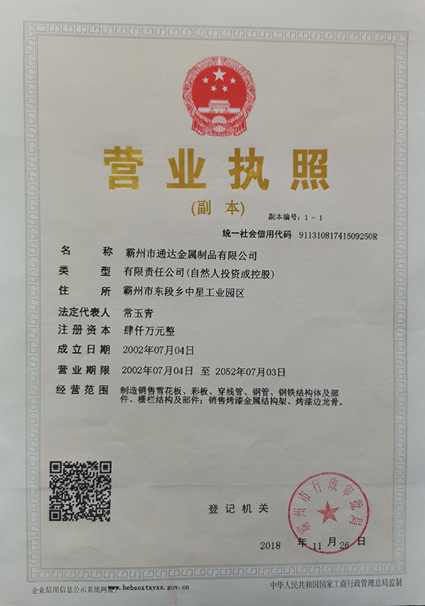 河北省霸州市通達金屬制品有限公司是一家生產熱鍍鋅管<預鍍鋅管>及熱鍍鋅板帶的生產企業(yè)。公司具有很強的經濟實力。本公司地理位置優(yōu)越,交通便利,處于京津保滄四大城市交匯中心的勝芳鎮(zhèn)。由于公司不斷發(fā)展壯大,良好的投資環(huán)境為我公司的發(fā)展提供了可靠的保障。本公司是河北省重合同守信用企業(yè),被評為AAA級信用企業(yè)。